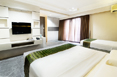 134,4 sqm Family room which offers modern minimalist decor that compliments living and work areas, modern bathroom with bathtub and walk-in shower, with 1(one) queen bed and 1 single bed completed with air conditioned and individual thermostat, private balcony, coffee & tea facility, LCD TV with 62 channels and broadband internet connection. The room is located on 2nd to 3rd floor